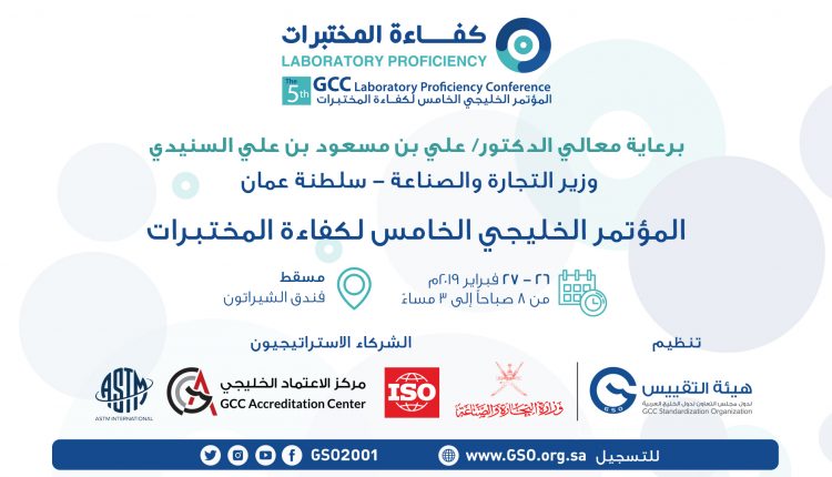 برعاية كريمة من معالي الدكتور علي بن مسعود بن علي السنيدي وزير التجارة والصناعة بسلطنة عمان، تنظم هيئة التقييس لدول مجلس التعاون لدول الخليج العربية المؤتمر الخليجي الخامس لكفاءة المختبرات بالتعاون مع وزارة التجارة والصناعة بسلطنة عمان، والمنظمة الدولية للتقييس ISO، ومركز الاعتماد الخليجي، والمنظمة الأمريكية للفحص والمواد ASTM، وذلك يومي 26-27 فبراير 2016م بمدينة مسقط.