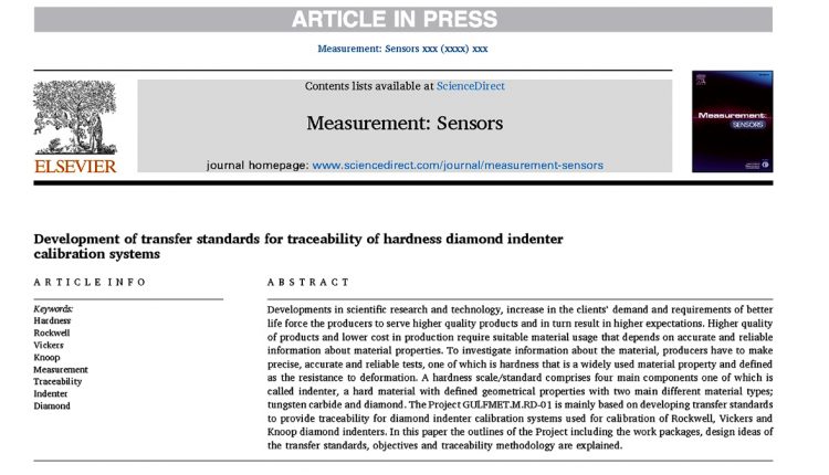 نشرت هيئة التقييس الخليجية بحثاً علمياً في مجال المترولوجيا بعنوان “دراسة وتصميم وإنتاج معايير قياس في مجال قياسات الصلادة (Hardness)، وذلك ضمن مشاريعها الاستراتيجية التي تهدف إلى دعم القدرات المترولوجية بالدول الأعضاء.
