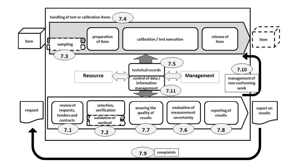 7. متطلبات العملية تشمل مراحل إجراء الإختبار/المعايرة بداية من التعاقد مع العميل وإختيار طريقة الاختبار والتحقق منها والأرتياب (اللايقين) في القياسات وحتى إصدار شهادات وتقارير النتائج ومروراً بالشكاوى وحالات عدم المطابقة.